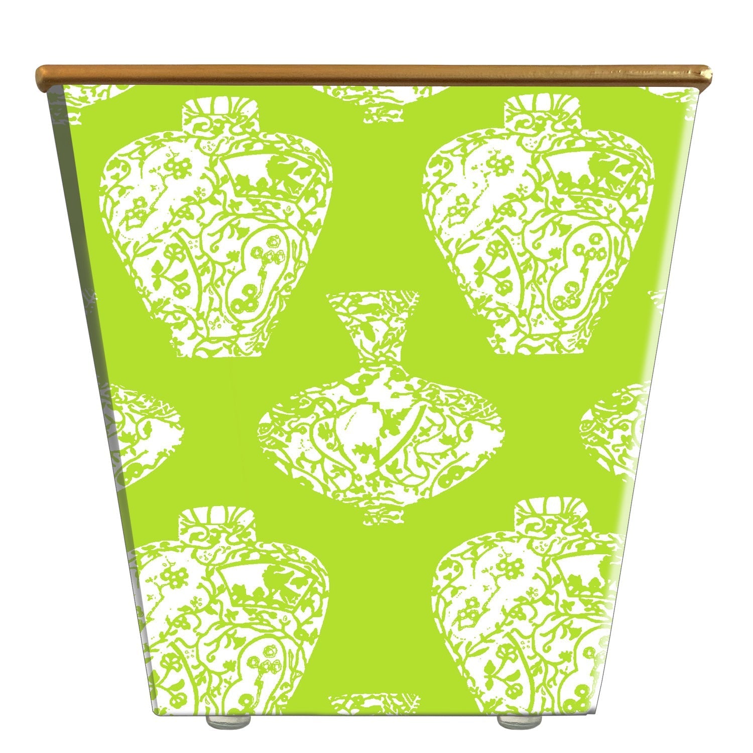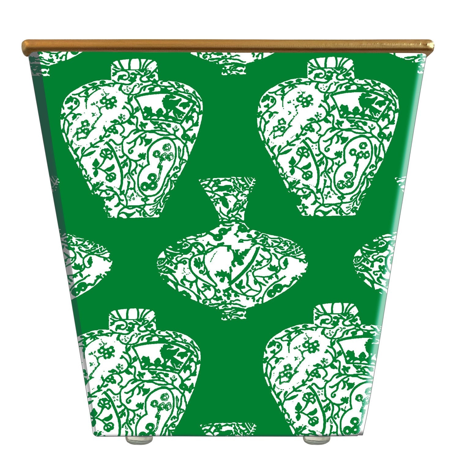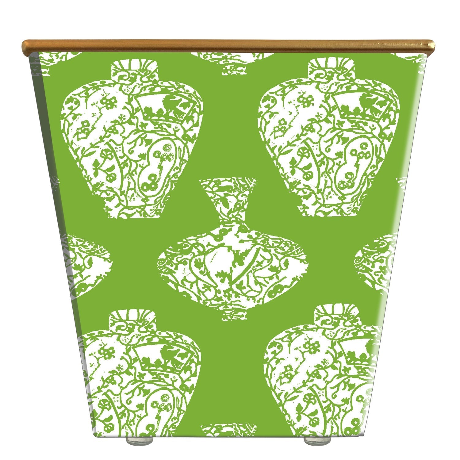 Handcrafted of composite material, wrapped in decorative paper, and finished with a burnished gold rim — four protective pads support its base. Proudly made in the USA!