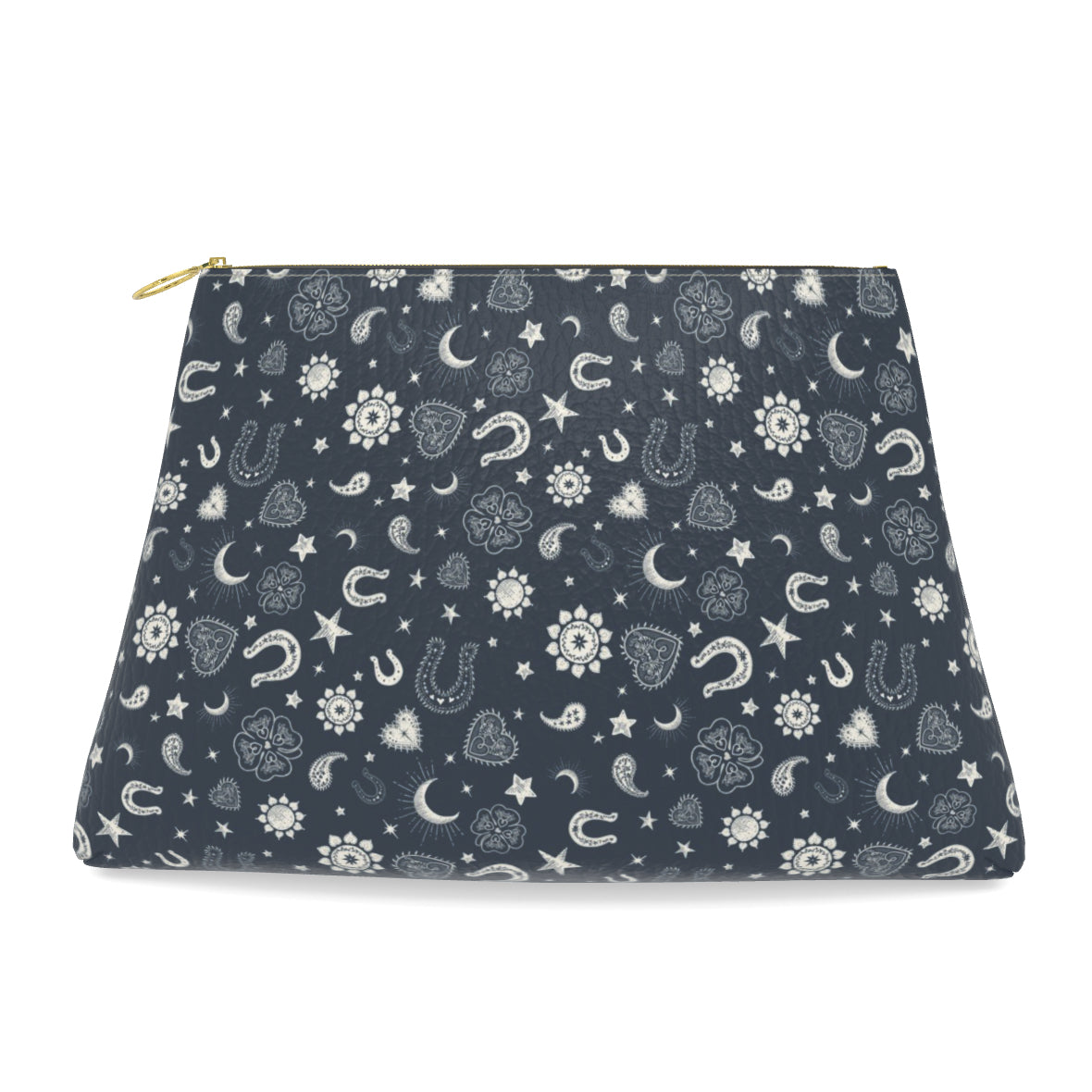 Featuring our exclusive house prints, a satin lined interior and a brass finished finger ring pull, this amply sized bag is sure to keep your tote tidy or keep your style fresh when you want a simple bag on the go! Brought to life by an independent female artist, each of the elements are carefully drawn and custom printed on textured Nappa leather. Hand made to order in London, England.