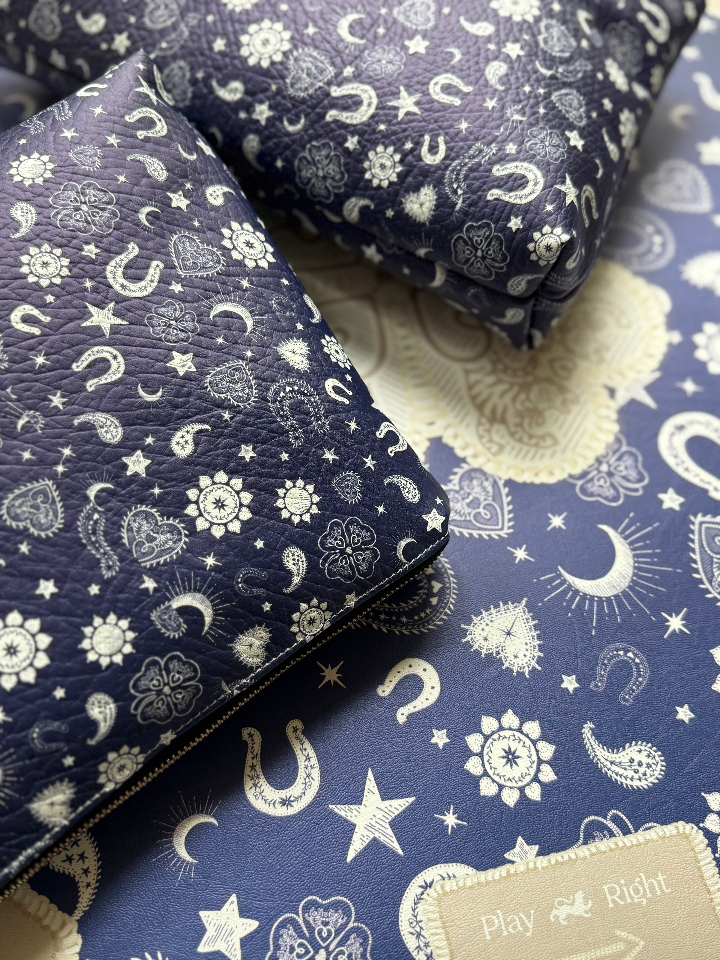 The HEARTS AND HORSESHOES design is your go-to lucky charm! Featuring a lively bandana pattern dotted with all your favorite symbols, it’s crafted to spread positive vibes wherever your adventures take you. Every symbol reflects our brand’s personality, created by a skilled independent female artist, making this bag a standout favorite for your game night fun.