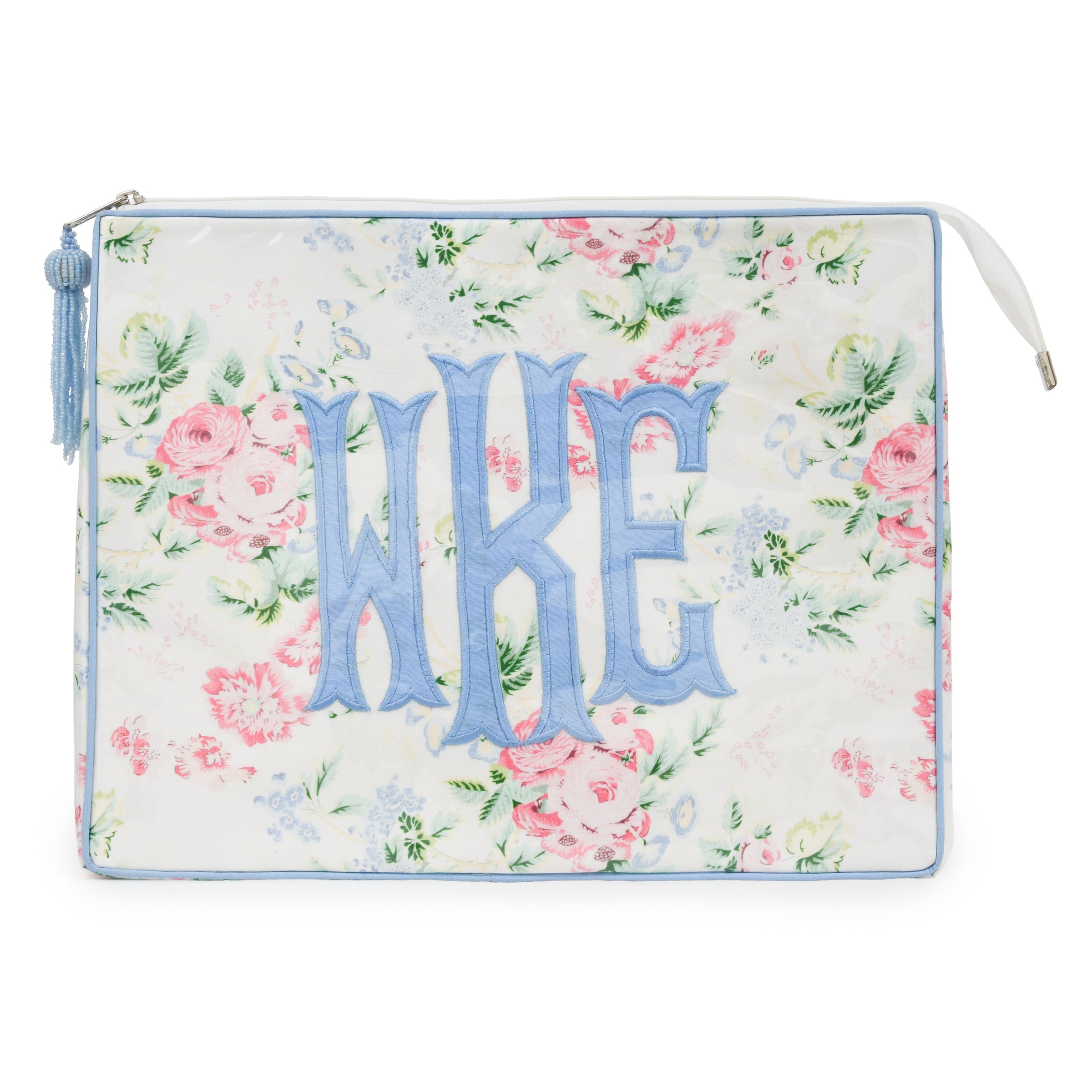 Straight top case with zipper closure and applique monogram.