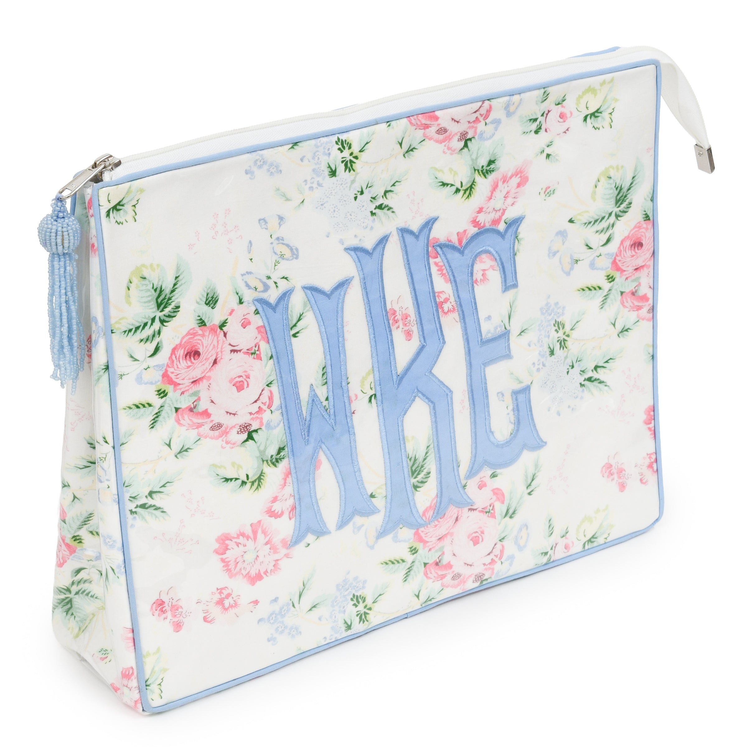 Vinyl lined inside and out with pockets inside. Interior color matches exterior block print. Additional zippered compartment on the back of the bag. Beaded tassel to match monogram and piping.