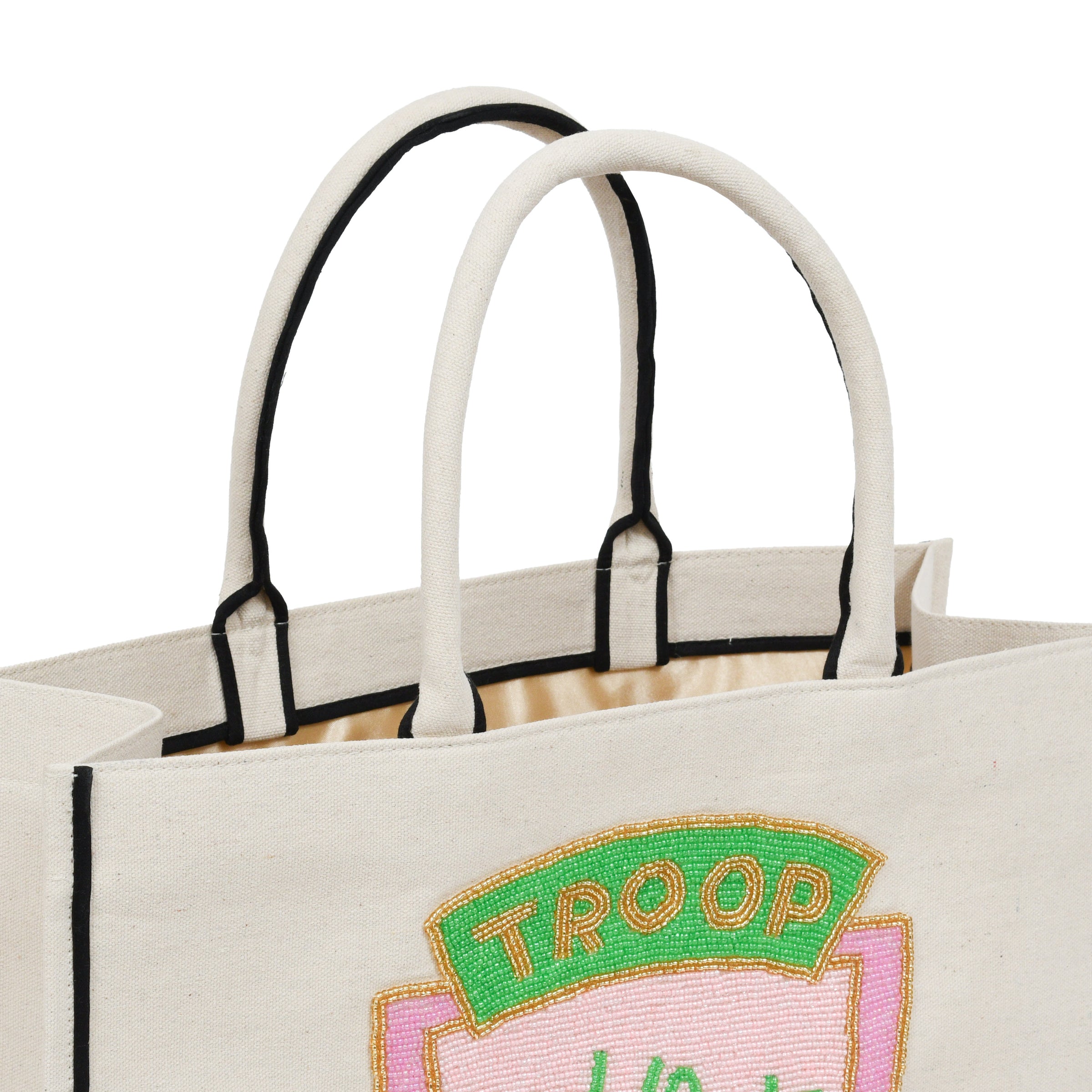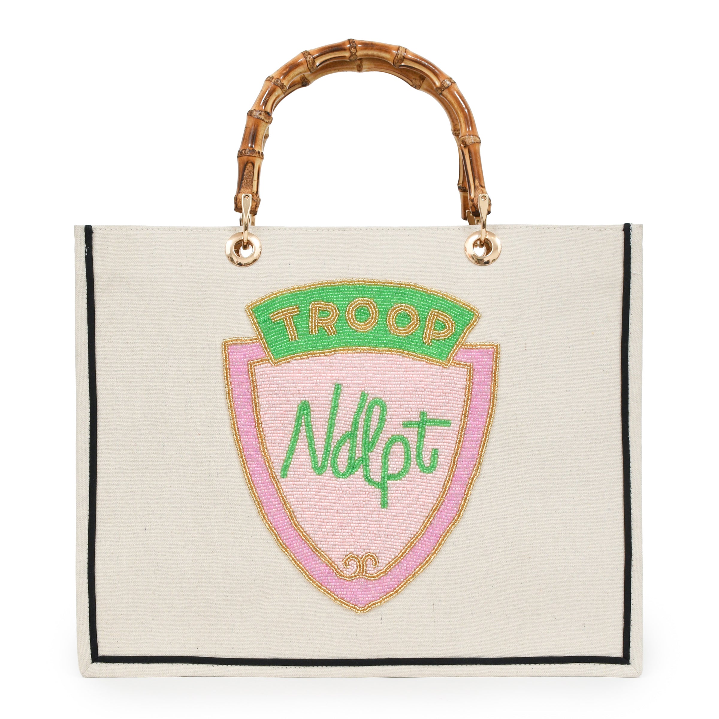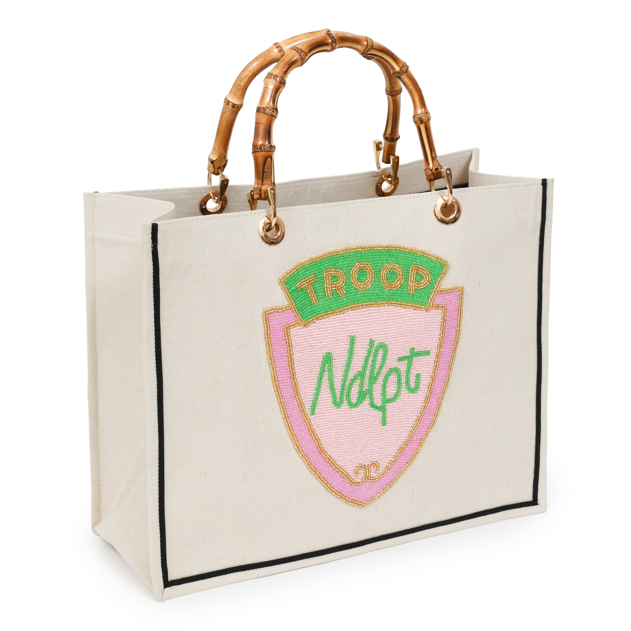 Die Canvas-Tasche mit vollständig perlenbesetzter Vorderseite ist 16″ breit, 13″ hoch und 6″ tief. Mit Satin gefüttert und mit einer kleinen offenen Innentasche. Oben offen. Wählen Sie Griffe aus Segeltuch oder Bambus.