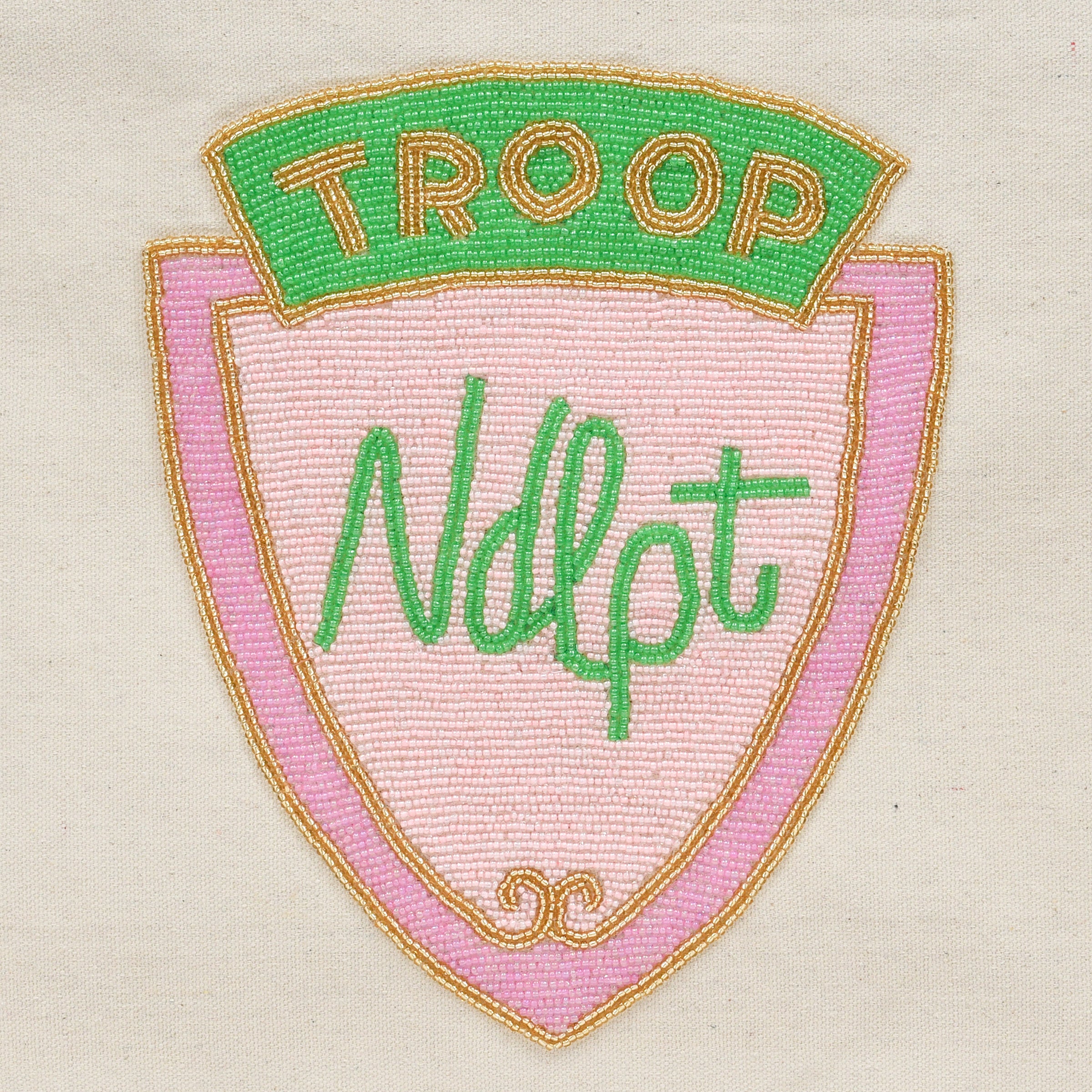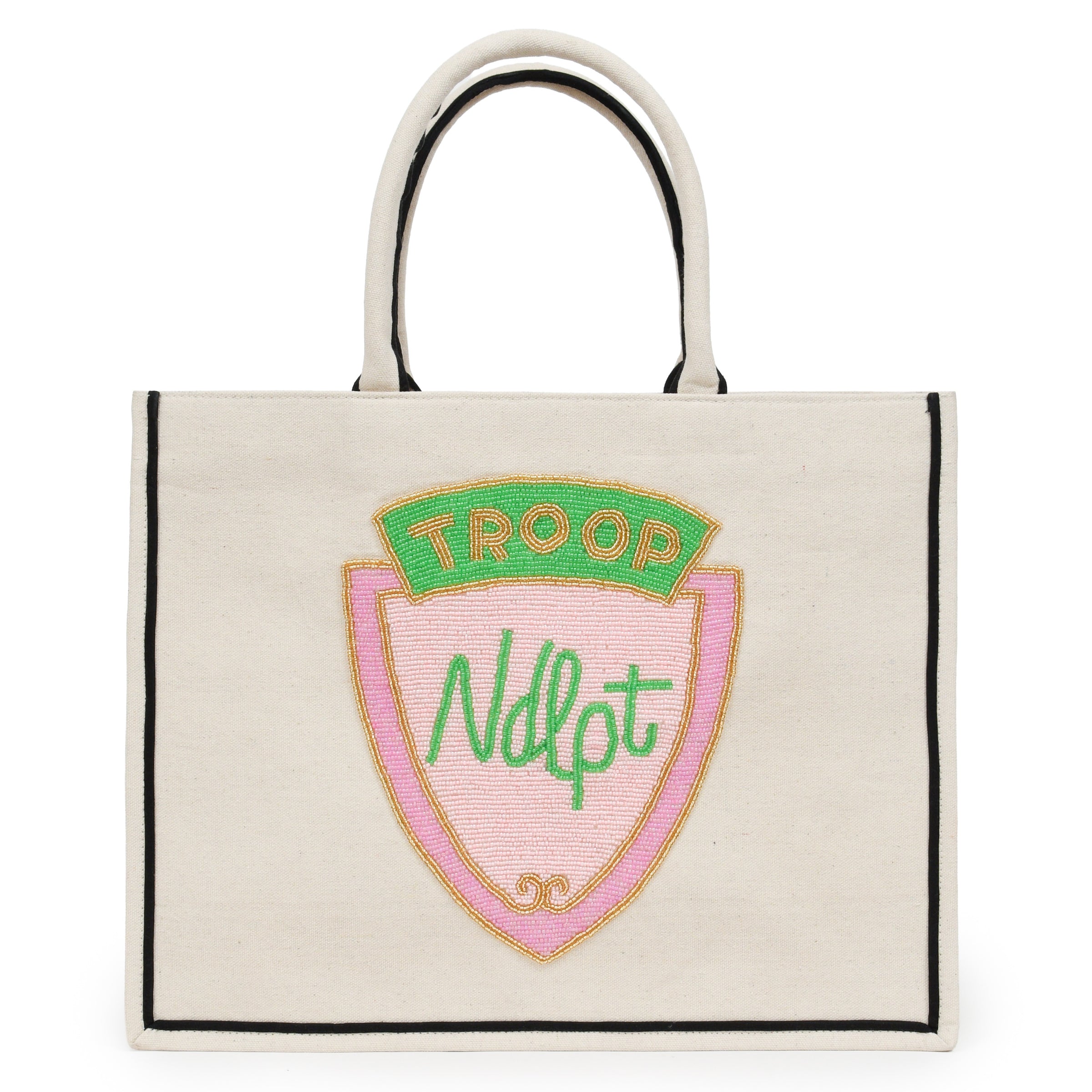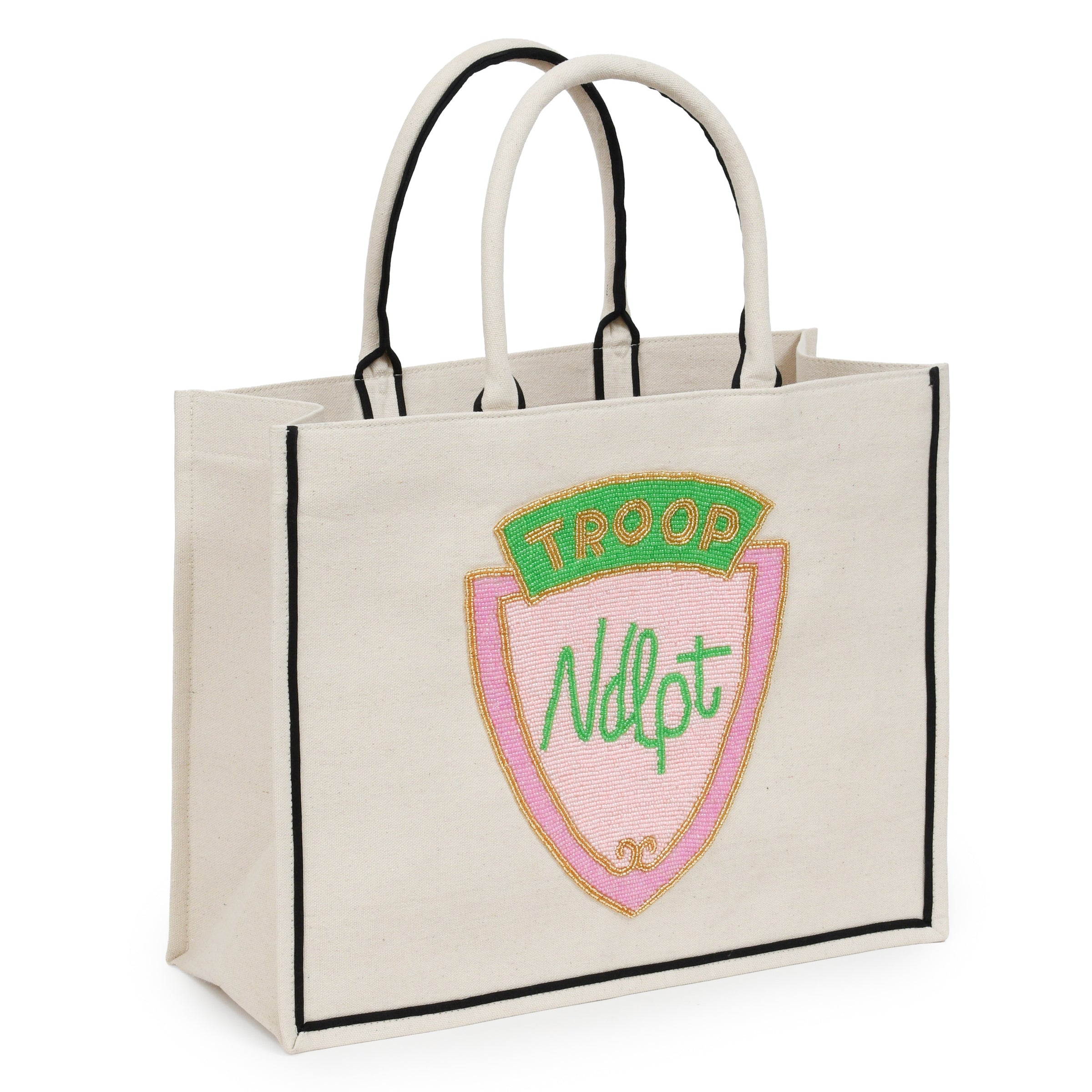 Die Canvas-Tasche mit vollständig perlenbesetzter Vorderseite ist 16″ breit, 13″ hoch und 6″ tief. Mit Satin gefüttert und mit einer kleinen offenen Innentasche. Oben offen. Wählen Sie Griffe aus Segeltuch oder Bambus.
